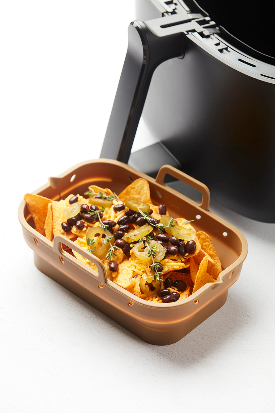 Snelle, smaakvolle nachos met gele paprika, rode bonen en tijm, perfect gebakken in de Point-Virgule siliconen airfryervorm. Knapperig, met kaas...