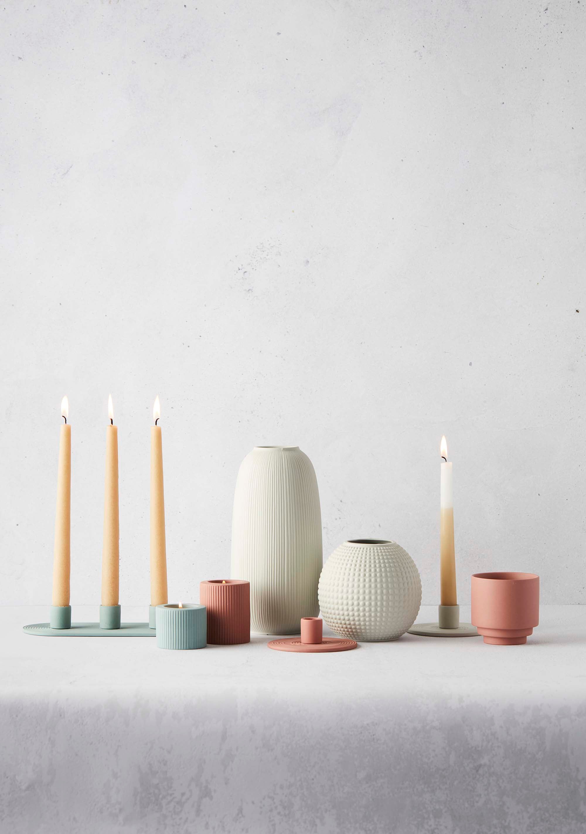 • Keramische woonaccessoires: waaronder vazen, plantenbakken, kandelaren en theelichthouders in lichtgrijs, saliegroen en oudroze. Sommige kandelaren kunnen ook als plantenbak worden gebruikt, waardoor stijl en functionaliteit samenkomen.