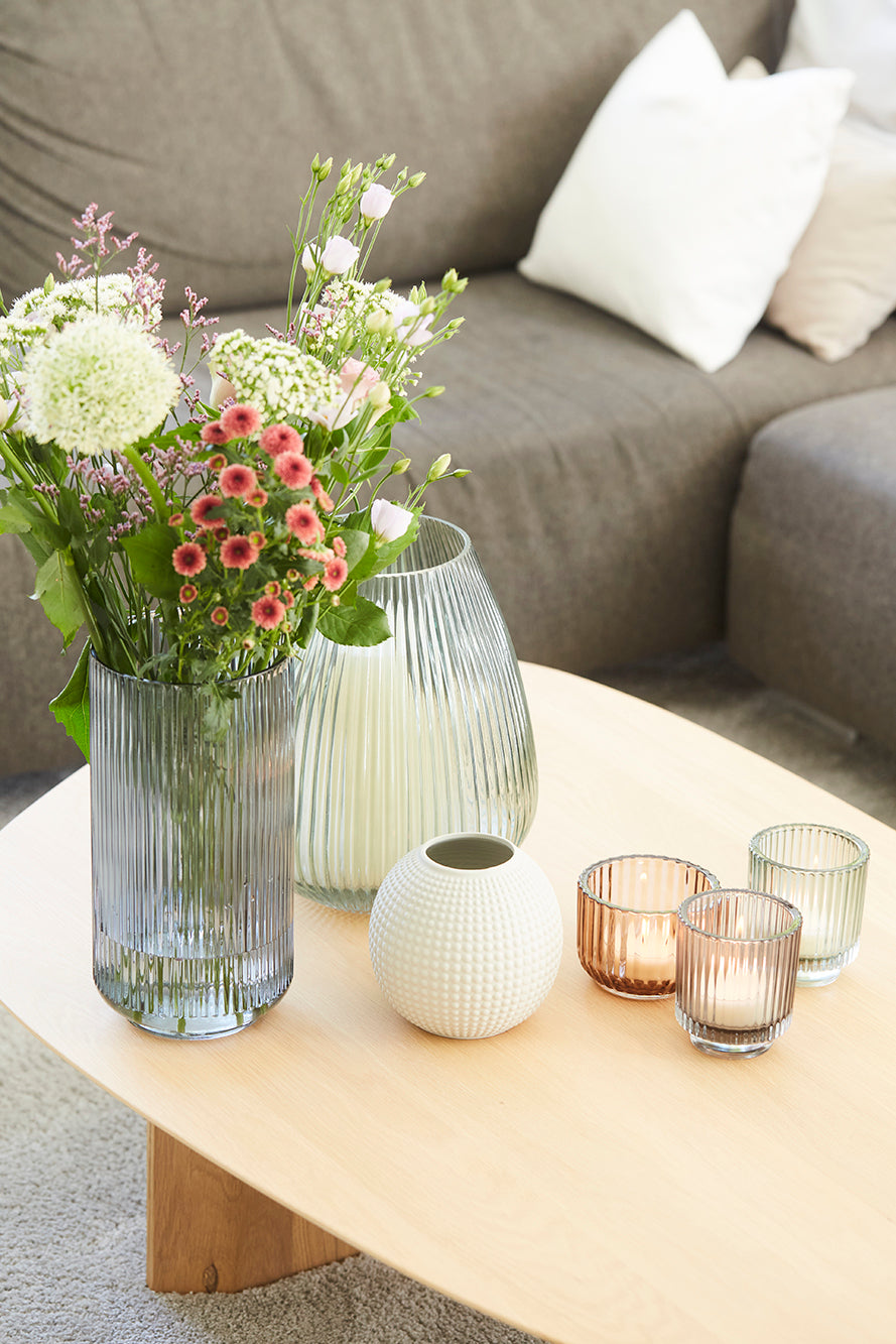 • Geribbelde vazen: modern en met structuur, verkrijgbaar in mokka, blauw en groen, perfect voor bloemen of als losse decoratie.