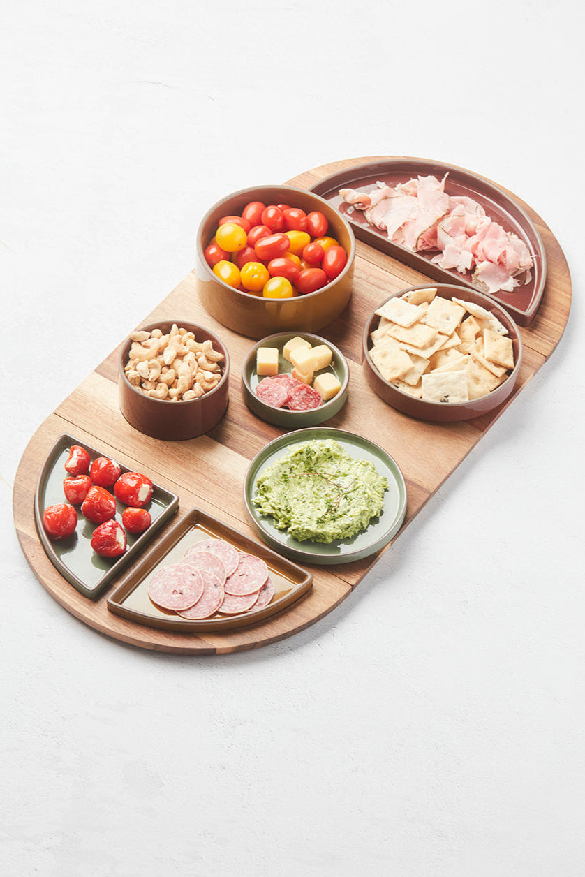 De warme tinten saliegroen, vintage bordeaux en komijn vullen het natuurlijke karakter van FSC®-gecertificeerd acaciahout prachtig aan. Perfect voor serveren, presenteren en genieten van je favoriete hapjes met flair.