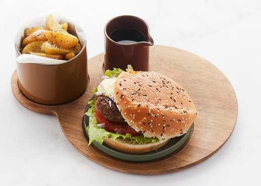 Zelfgemaakte hamburgers & aardappelpartjes, stijlvol geserveerd met onze burgerset